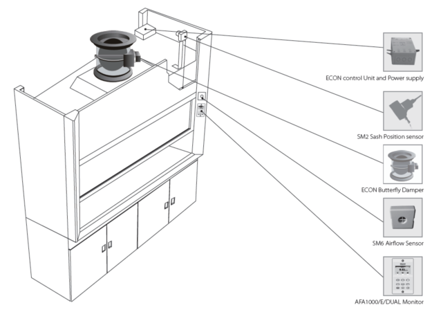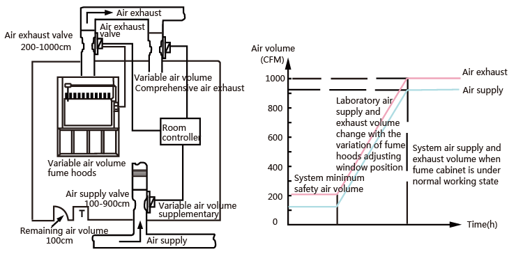 Variable air volume control system is to adjust the system air supply and exhaust volume according to the change of fume hoods opening degree in laboratory, thus guaranteeing the surface wind speed of fume hoods is 0.5m/s. The system safety is improved and adaptability is strengthened, reducing energy consumption under the premise of fully ensuring safety.